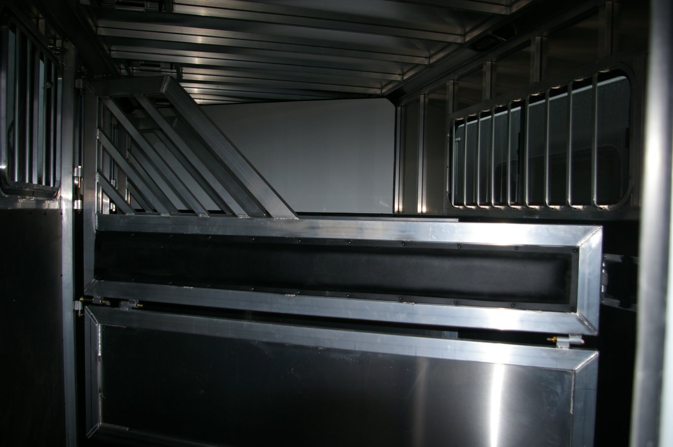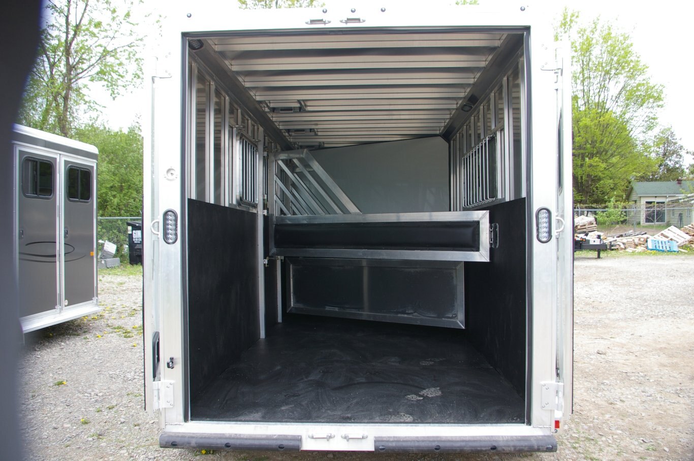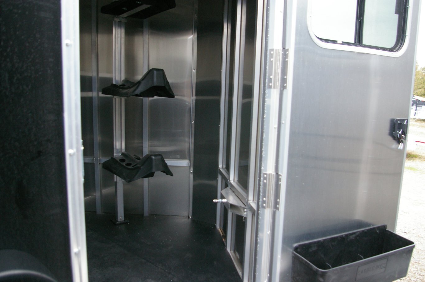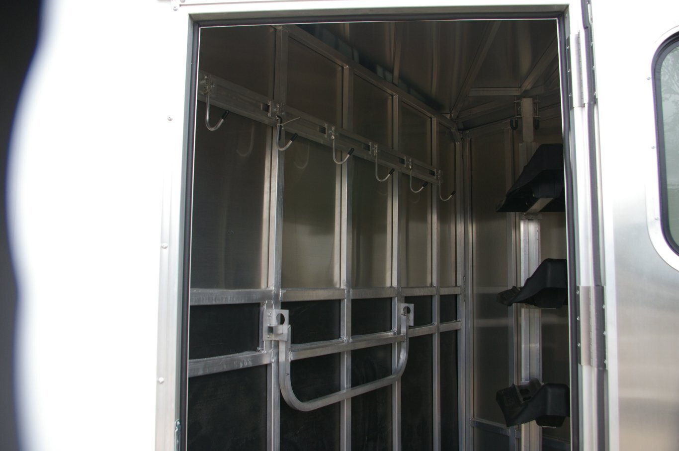 STANDARD FEATURES Tandem 3.5K Braked, Dexter Leaf Spring Axles Silver Mods., 205/75R15 - 6 Lug Wheels Heavy Duty Rear Step-Up Rubber Bumper 60/40 Double Rear Doors w/ (1) 18”x24” Window w/ Premium Aluminum Hinges (Installed w/ Huck Bolts) Removable Jail Bar Head and Shoulder Dividers w/ New Slam Latch System 30”x24” Radius Drop Down Feed Windows w/ Integrated Face Bar (1-per stall) 53”x19” Sliding Window on Rump Wall 1/2” Rubber Mats Heavy Duty Wall Liner and Rear Door Liner in Horse Area Safety Chains Across Rear Opening (2) Inside and (1) Outside Tie-Ring, Per Horse (1) LED Dome Light in Horse Area w/ 15’ Floor, 6’8” Wide, 7’ Tall, 40-1/2” Stall Width Bumper Pull, V-Nose, 24” Stone Guard Improved All Box Tube Aluminum Chassis One Piece, .024 Aluminum Roof w/ Heavy Duty Radius Roof Extrusion 2”x8” Pressure Treated Decking; 16” O/C I-Beam Crossmembers Exterior LED Light .040 Pre-Painted Exterior Side Sheets Toggle Switch (1) Double Action Pop-up Vent Per-Stall 32”x72” Tack Storage Door w/ Sliding Window Tack Room Features - 36” Short-Wall, 1/2” Rubber Mats, LED Dome Light, Removable Saddle Tree, Bridle Hooks and Brush Tray 5-Year Limited Warranty