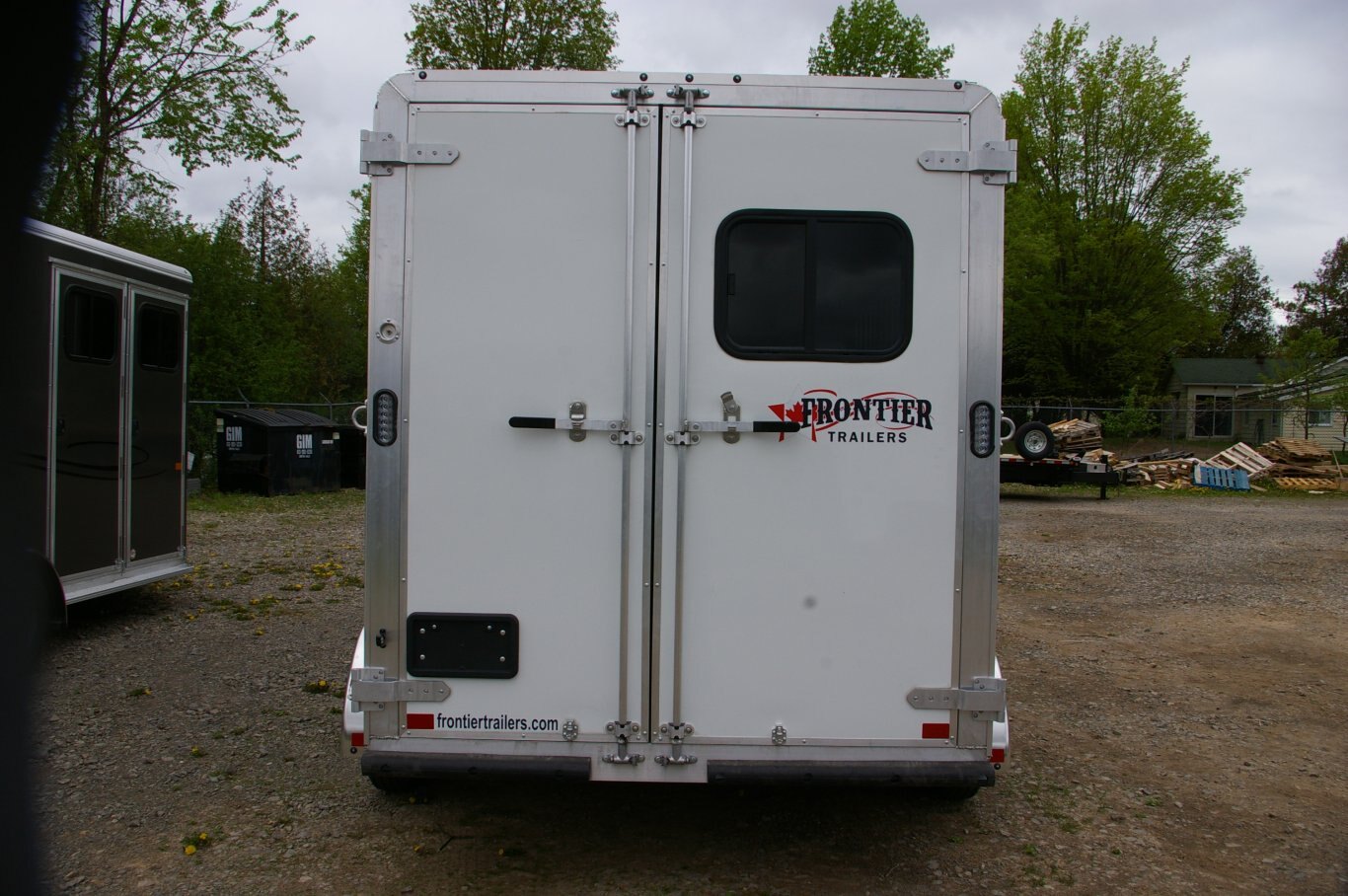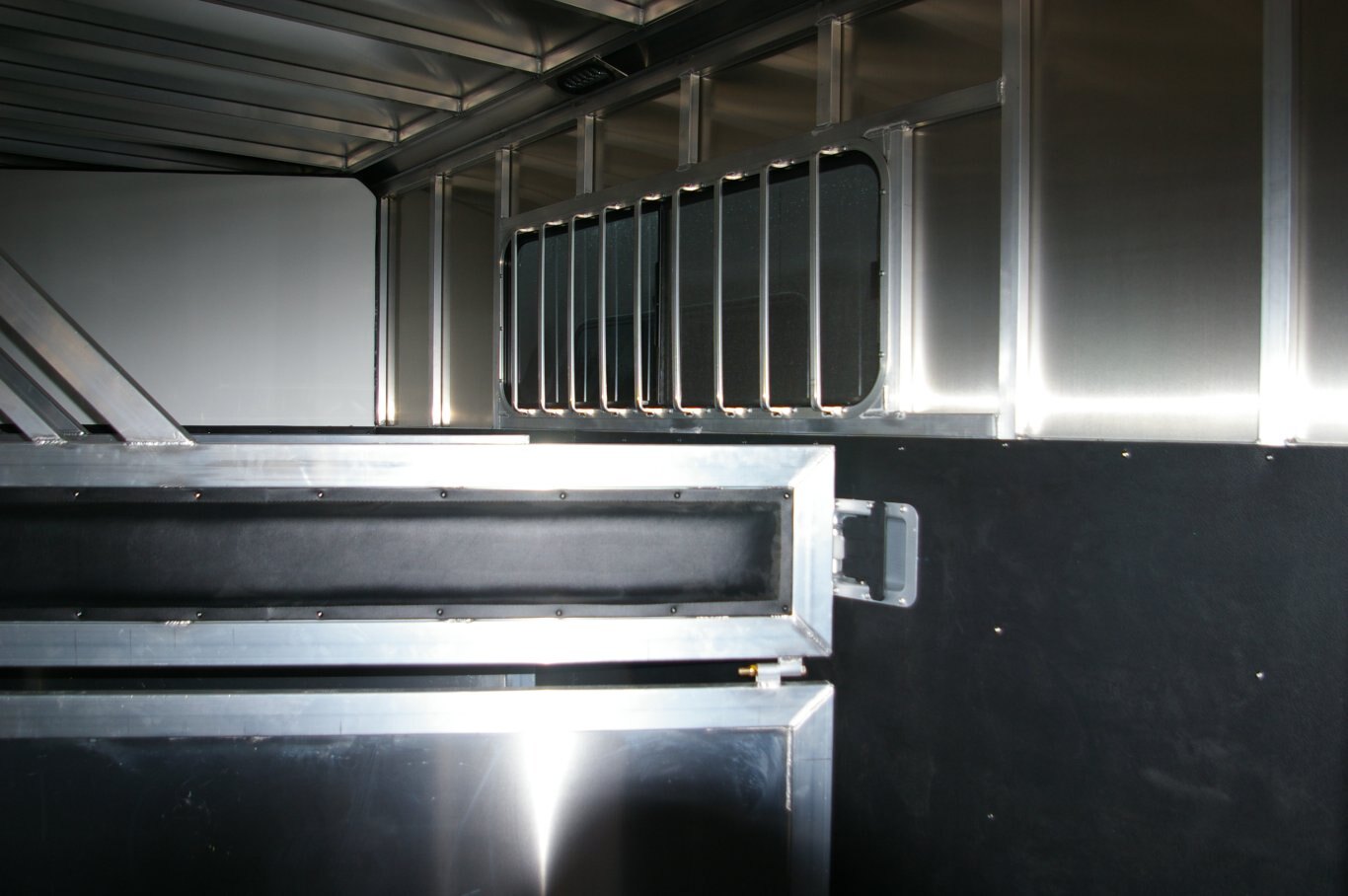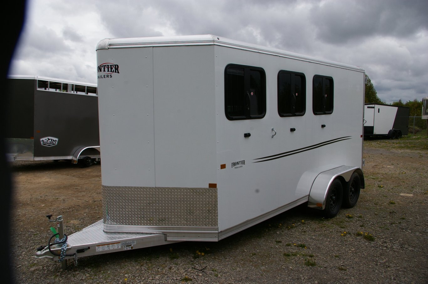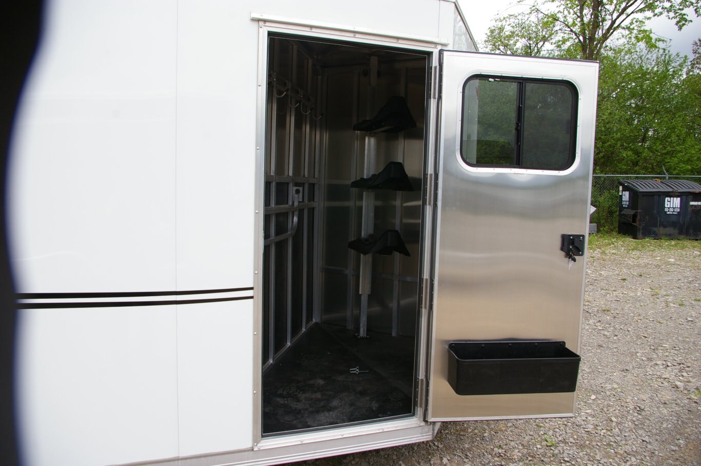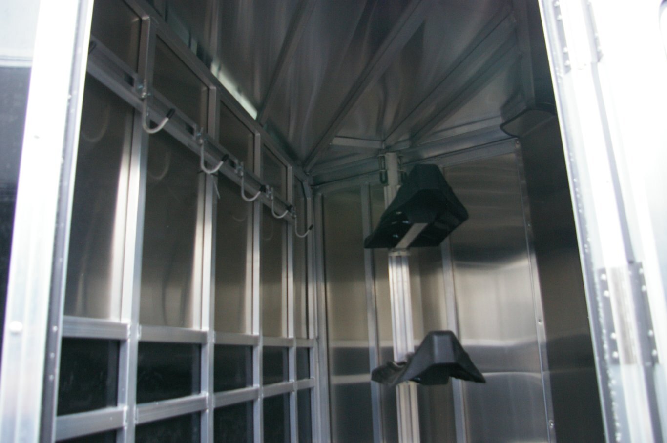 STANDARD FEATURES Tandem 3.5K Braked, Dexter Leaf Spring Axles Silver Mods., 205/75R15 - 6 Lug Wheels Heavy Duty Rear Step-Up Rubber Bumper 60/40 Double Rear Doors w/ (1) 18”x24” Window w/ Premium Aluminum Hinges (Installed w/ Huck Bolts) Removable Jail Bar Head and Shoulder Dividers w/ New Slam Latch System 30”x24” Radius Drop Down Feed Windows w/ Integrated Face Bar (1-per stall) 53”x19” Sliding Window on Rump Wall 1/2” Rubber Mats Heavy Duty Wall Liner and Rear Door Liner in Horse Area Safety Chains Across Rear Opening (2) Inside and (1) Outside Tie-Ring, Per Horse (1) LED Dome Light in Horse Area w/ 15’ Floor, 6’8” Wide, 7’ Tall, 40-1/2” Stall Width Bumper Pull, V-Nose, 24” Stone Guard Improved All Box Tube Aluminum Chassis One Piece, .024 Aluminum Roof w/ Heavy Duty Radius Roof Extrusion 2”x8” Pressure Treated Decking; 16” O/C I-Beam Crossmembers Exterior LED Light .040 Pre-Painted Exterior Side Sheets Toggle Switch (1) Double Action Pop-up Vent Per-Stall 32”x72” Tack Storage Door w/ Sliding Window Tack Room Features - 36” Short-Wall, 1/2” Rubber Mats, LED Dome Light, Removable Saddle Tree, Bridle Hooks and Brush Tray 5-Year Limited Warranty
