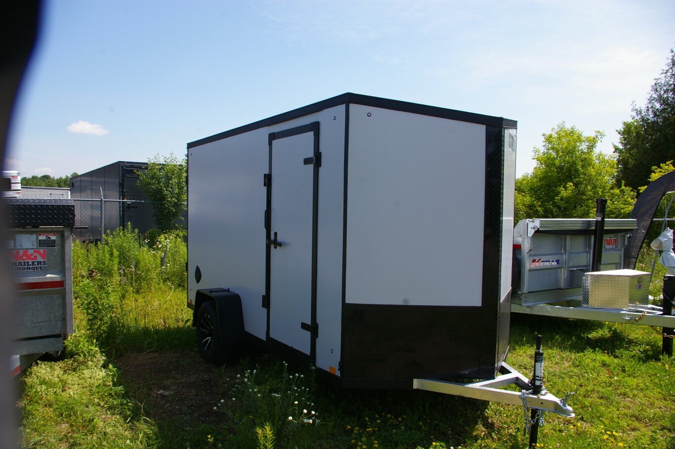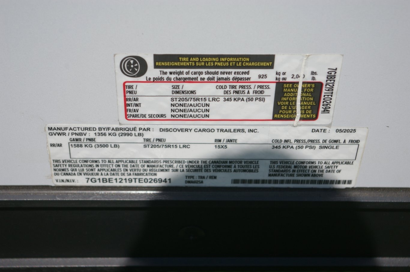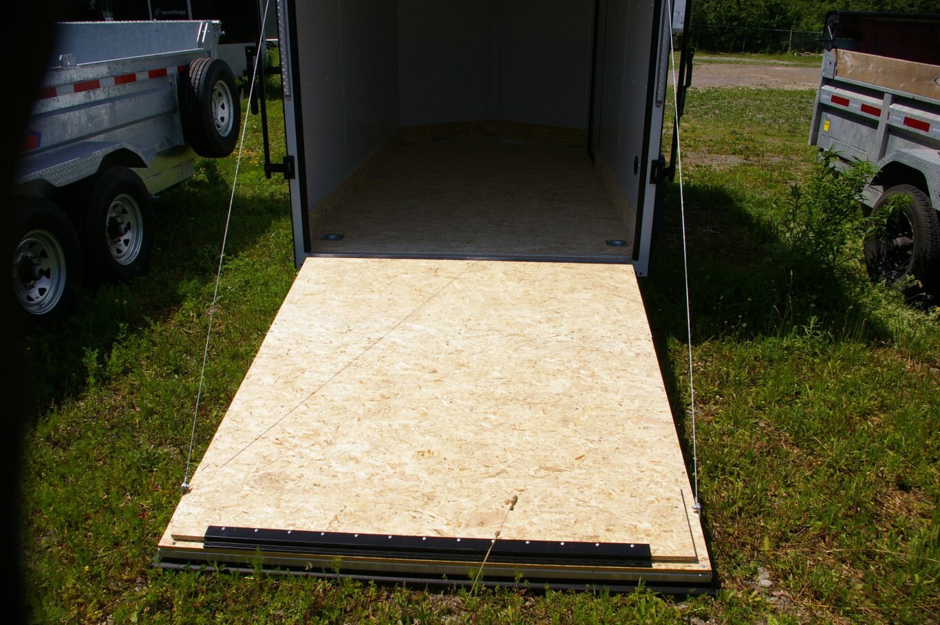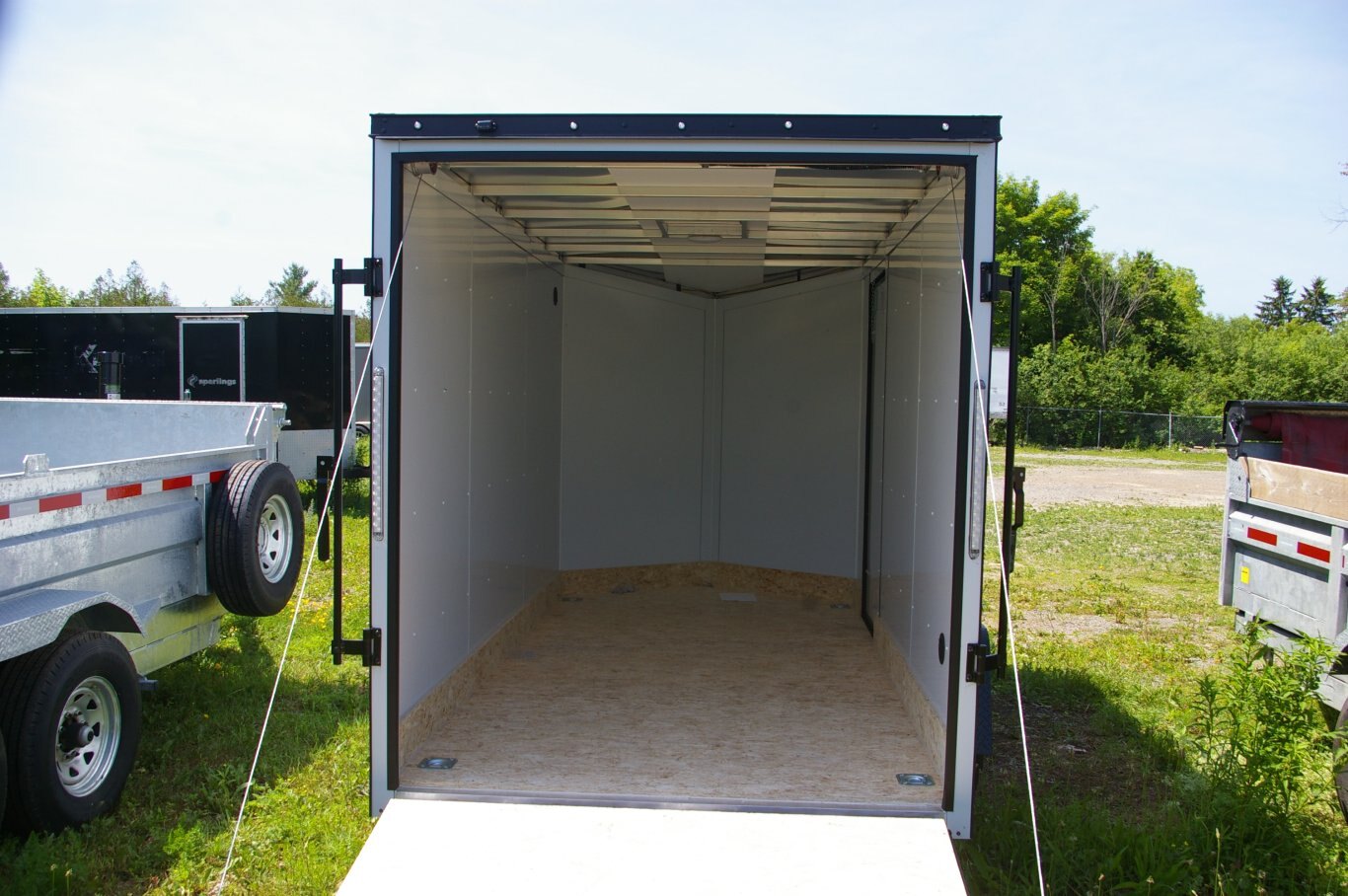Frame Exterior Steel Tube Roof Bows (24" O/C) Painted Tongue / Rear Sill-Black Smooth Aluminum Fenders Interior Roof Vent or Flo-Thru Vents 3/4" Drymax Flooring Framed for Roof Vent 3/8" Drymax Wall Liner Zinc Hardware Aluminum Hinges Aluminum Door Holdbacks Electrical White Vinyl Above Bows Axle Features Single Axle 2" Coupler (1) 12V L.E.D. Dome Lights w/ Switch 4 Way Electrical Plug Tandem Axle 2-5/16" Coupler (2) 12V L.E.D. Dome Lights w/ Switch L.E.D. Taillights & Bullet Marker Lights (4/Side) Axles/Wheels Round Top w/.080 Roof Coves (No Wedge) OR Flat Top w/ Wedge Front 6" Barrier Tape 7 Way Electrical Plug ST205/75R15"Radials on Silver Mod Wheels Safety/Warranty 1 Year Limited Warranty D.O.T / C.S.A Approved Safety Equipment